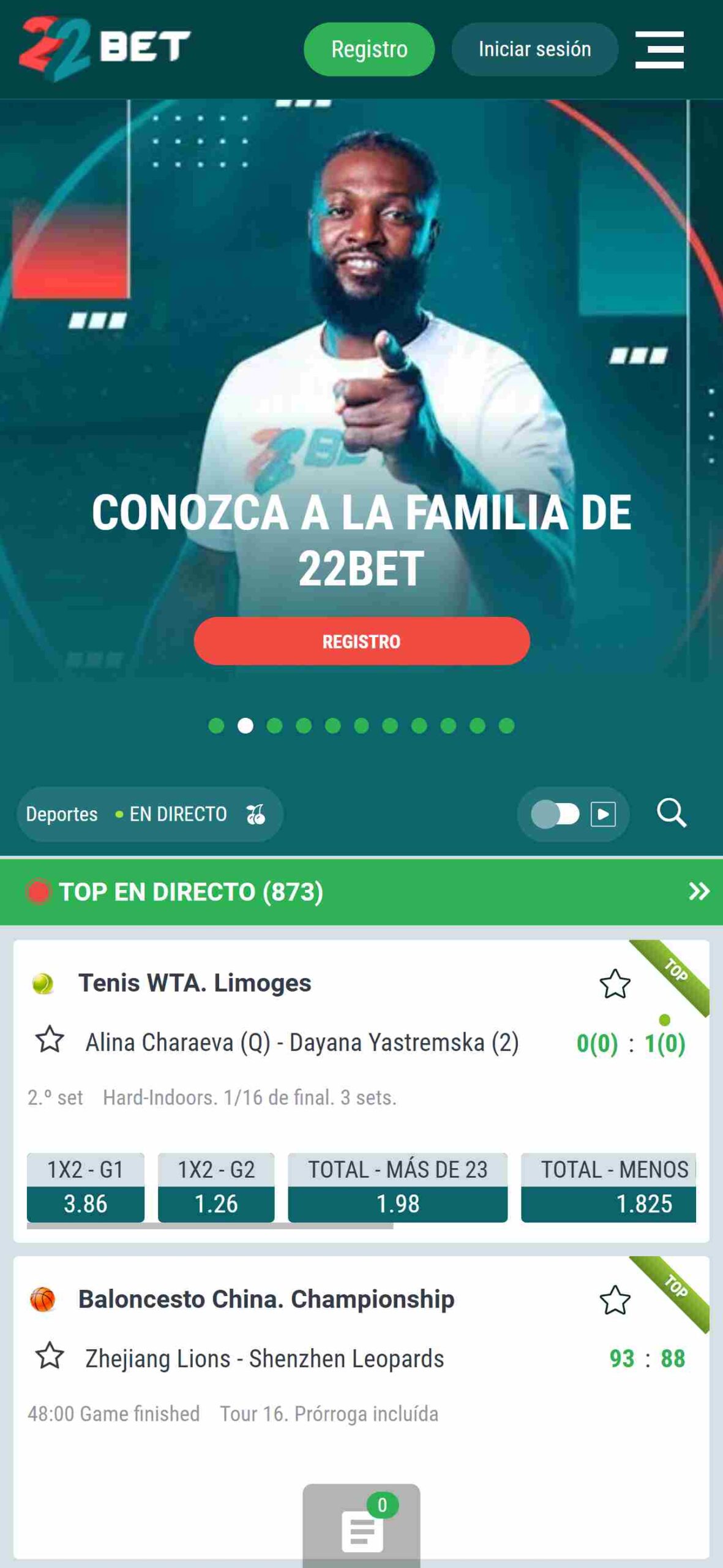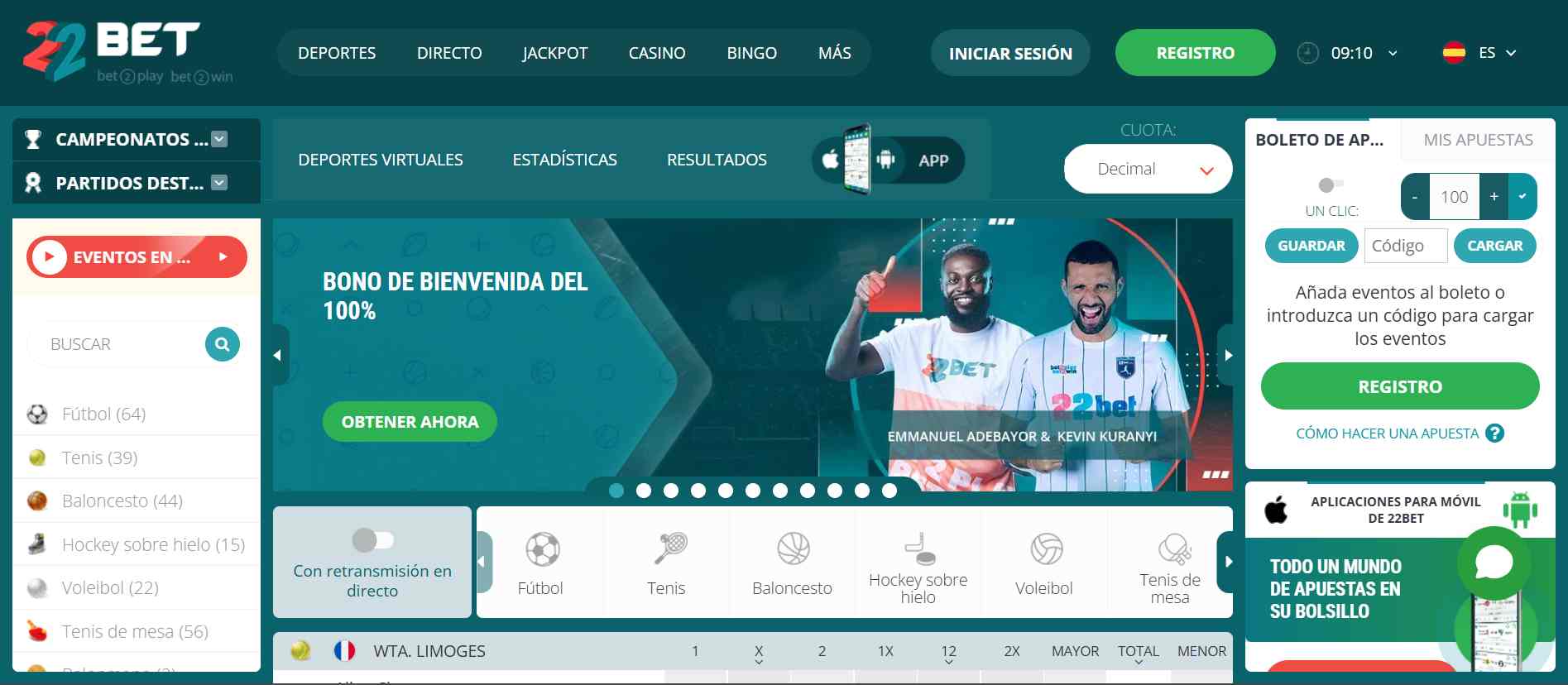Si lo que le gusta es apostar al momento del partido porque saca mejores pronósticos mientras vive la acción, 22Bet apuestas deja a su disposición más de 100 eventos diarios en su sección en “DIRECTO”. Además, puede observar las retransmisiones en video, obtener información extra de las estadísticas, clasificaciones y otros datos entregados por el website para afinar sus pronósticos.