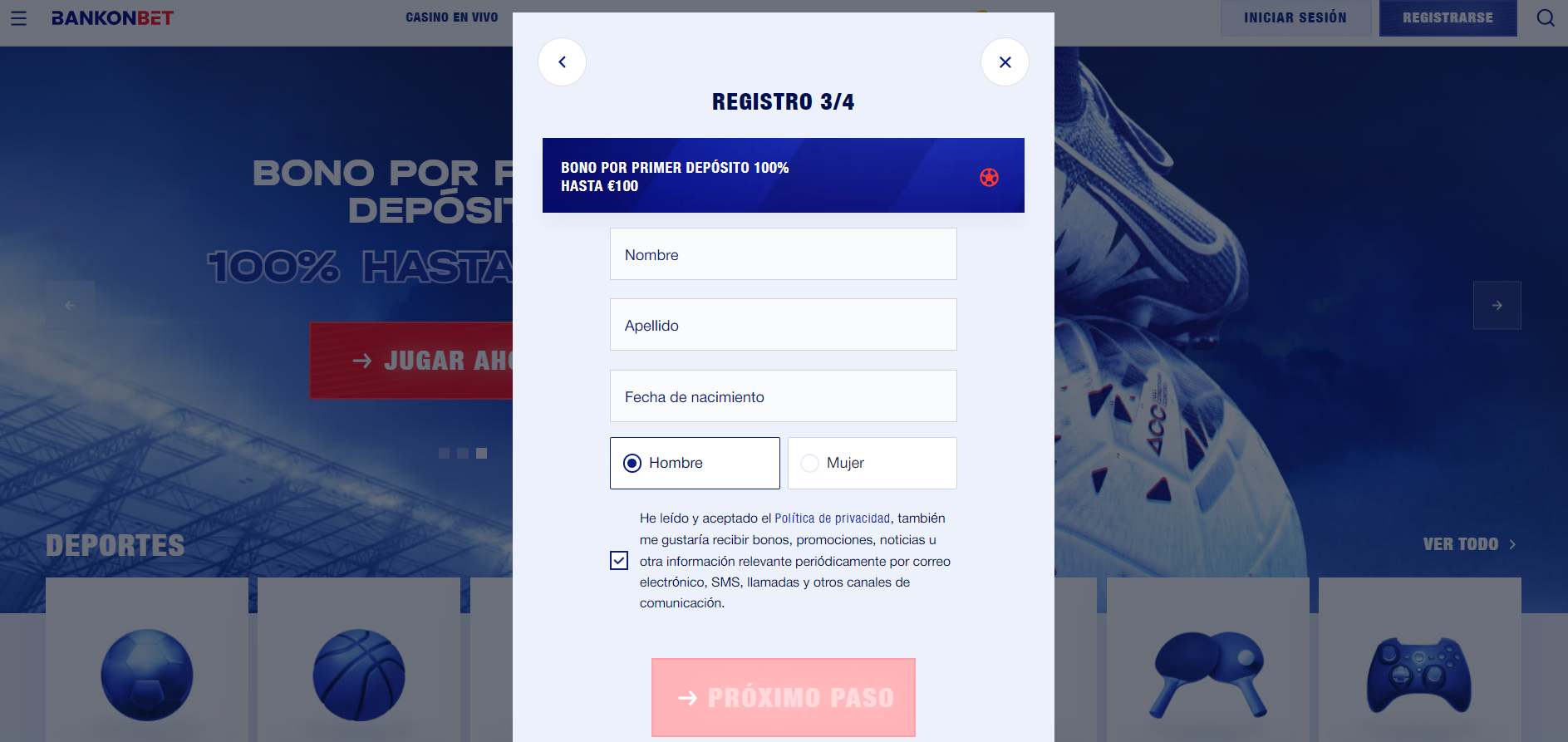 El portal de apuestas Bankonbet recibe a los nuevos usuarios del sitio con un bono de bienvenida que no querrán dejar pasar. El bono de bienvenida Bankonbet es del 100% hasta 500 PEN. Para obtener el bono, debes depositar al menos 100 PEN y apostar una vez el importe del depósito con una cuota mínima de 1,50. Luego, debes apostar seis veces el importe del bono y el depósito a cuotas de 1,50 por selección en combinadas o 2,00 o más en simples.