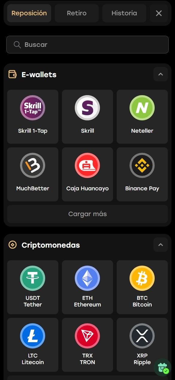 La variedad de pagos en FairSpin se actualizan según el país desde el que te encuentres apostando. En el caso de perú, las opciones para realizar depósitos y retiros incluyen Tarjetas, Banca electrónica, eWallets y Criptomonedas, siendo estas últimas una de las que más alberga alternativas.