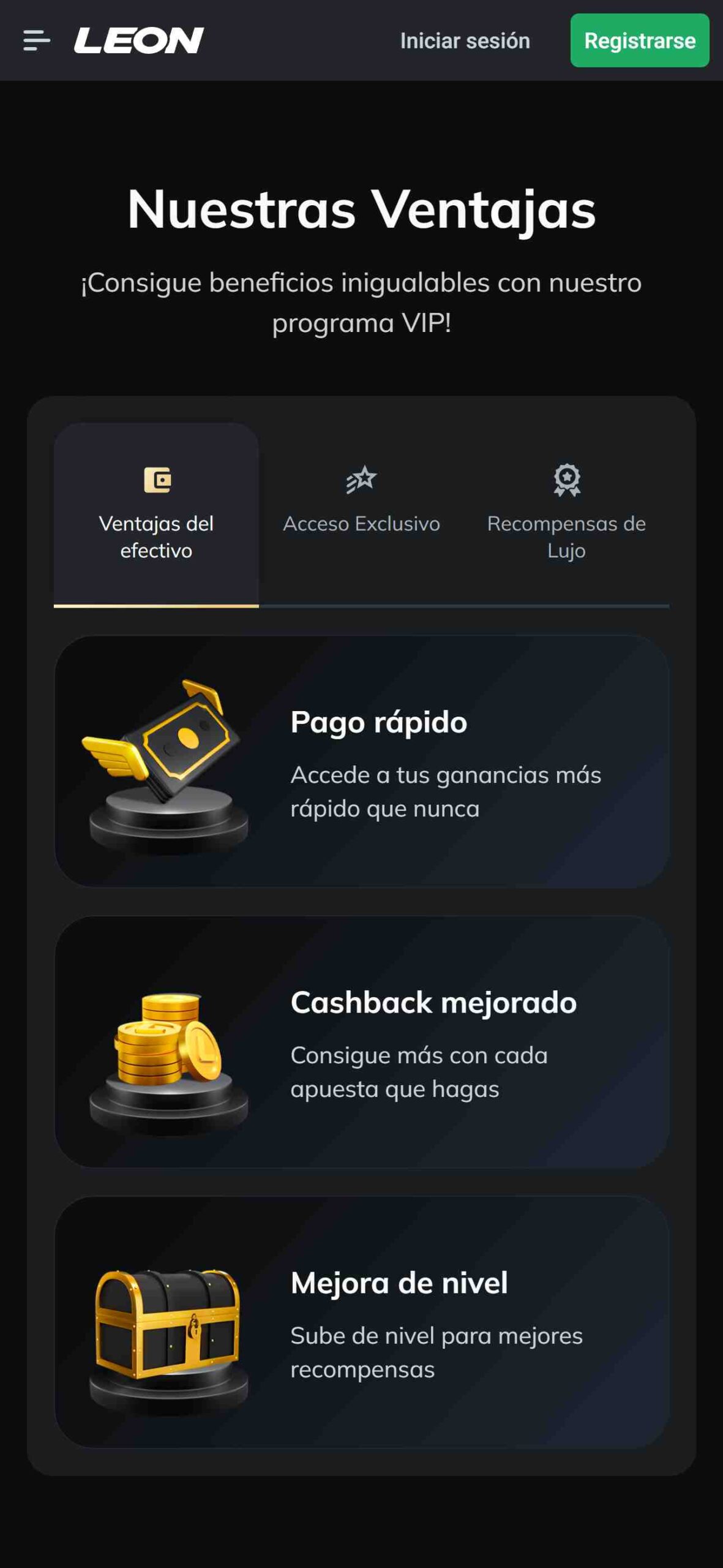 Si ya culminaste con esta opción de bono, Leon Perú te ofrece otras promociones y hasta podrás unirte al Lounge VIP, donde obtendrás beneficios exclusivos, como cashback mejorado, acceso exclusivo y recompensas de lujo. Además, puedes participar en torneos y ganar más premios.