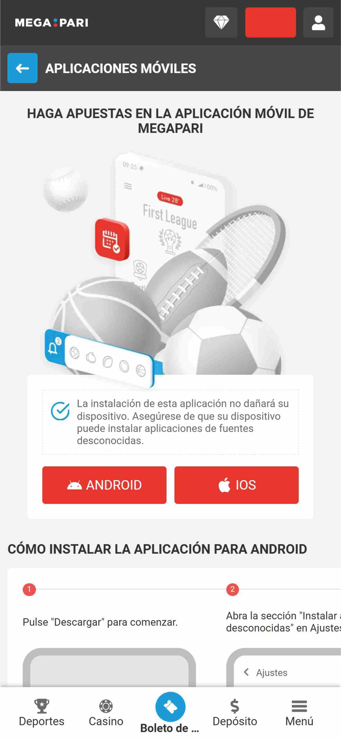 Si deseas apostar desde tu dispositivo móvil o tablet, con Megapari es posible a través del navegador o aún más fácil si descargas la app, disponible para sistemas operativos Android y iOS. Para descargar solo debes seguir estos pasos:
