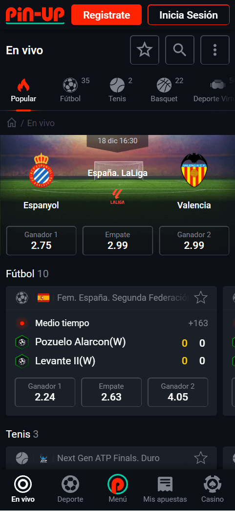 Realizar apuestas en vivo con Pin-up es simple. Accede a la categoría “En vivo” y revisa los eventos del día. En la parte superior, puedes hallar los eventos más populares del momento, así como también la lista de deportes con opción de apuestas en tiempo real.